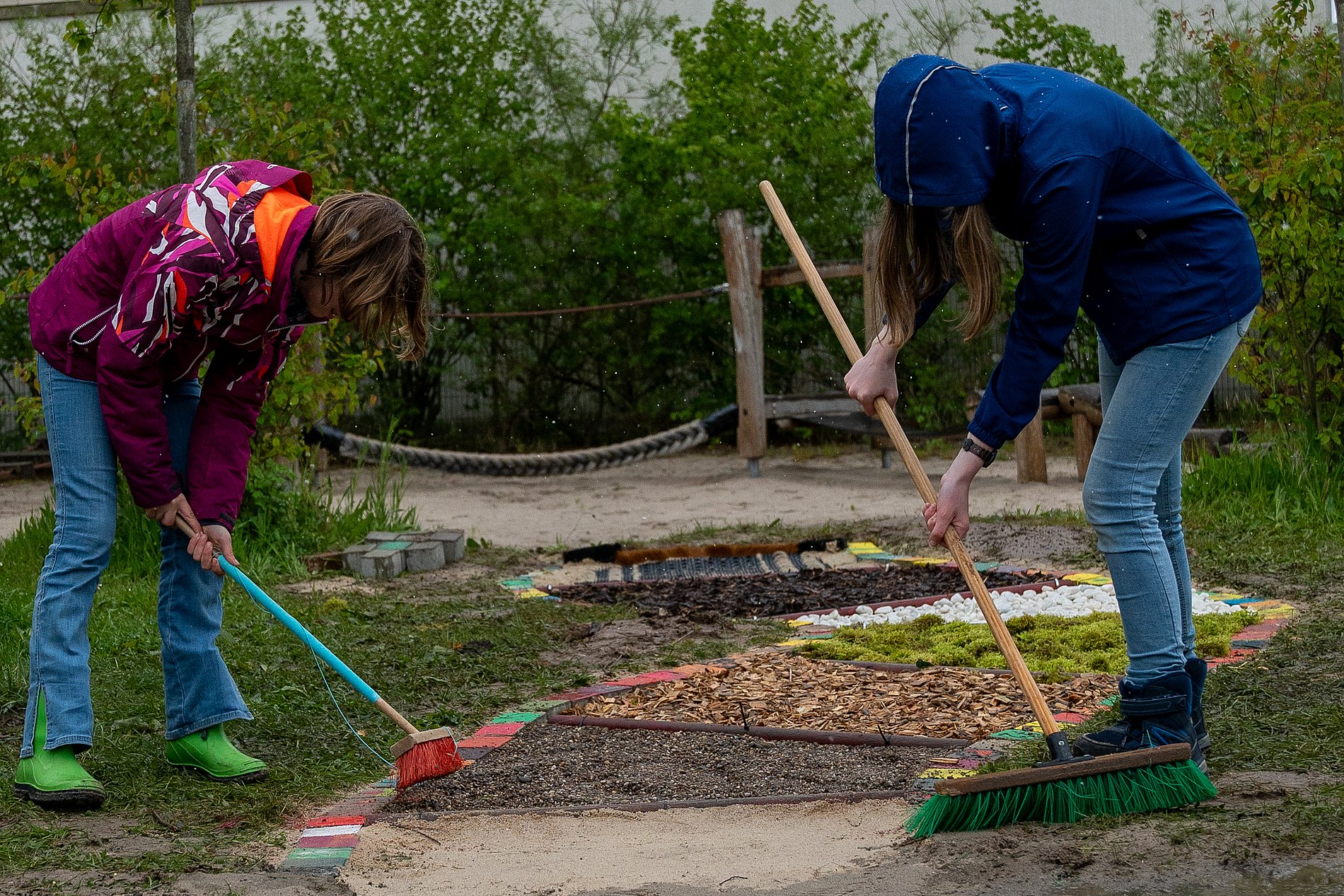 Die Pfarrjugend und Minis der Pfarrei St. Hildegard in Frankfurt legen einen Fühlpfad auf dem Außengelände der Caritas Kita St. Lioba in Frankfurt-Nied an.