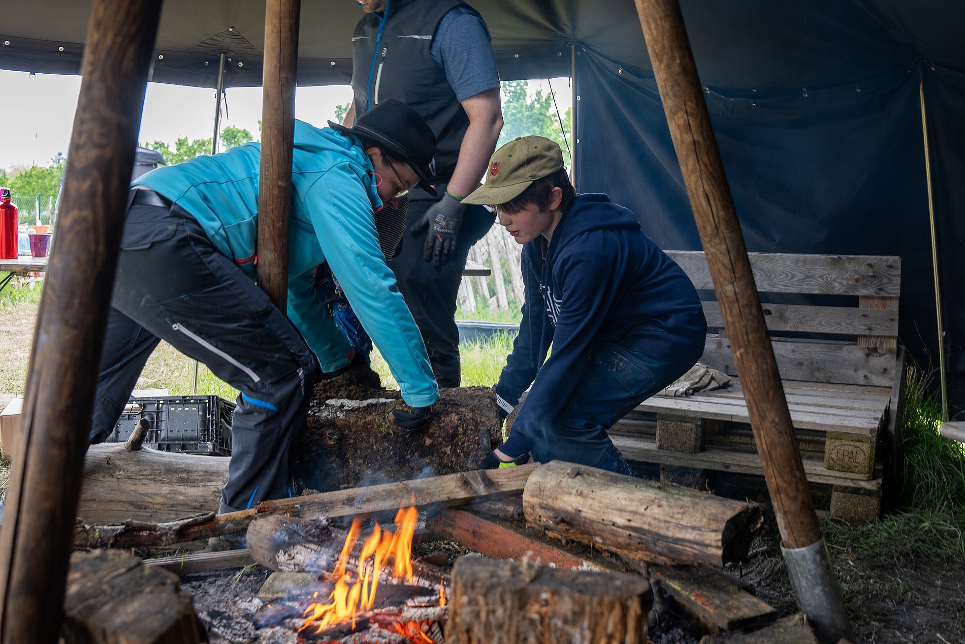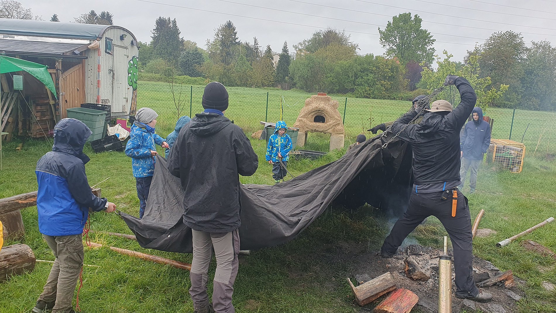 Charlotte beäugt die nassen Sprossen der Leiter. Es regnet in Strömen – doch das Dach des Backhauses auf dem Abenteuerspielplatz Colorado muss neu gedeckt werden. „Kletter nur hoch, wenn du dir sicher bist, dass du nicht ausrutschst“, sagt Alexander Schrörs, Gruppenleiter des Pfadfinderstammes St. Bonifatius aus Sachsenhausen. „Du weißt selbst am besten, was du dir zutraust.“ Die 14-Jährige überlegt kurz, dann steigt sie auf die Leiter und nimmt das löchrige Dach in Augenschein. Ihr Urteil: „Hier muss ganz schön was gemacht werden, wir brauchen Holz!“