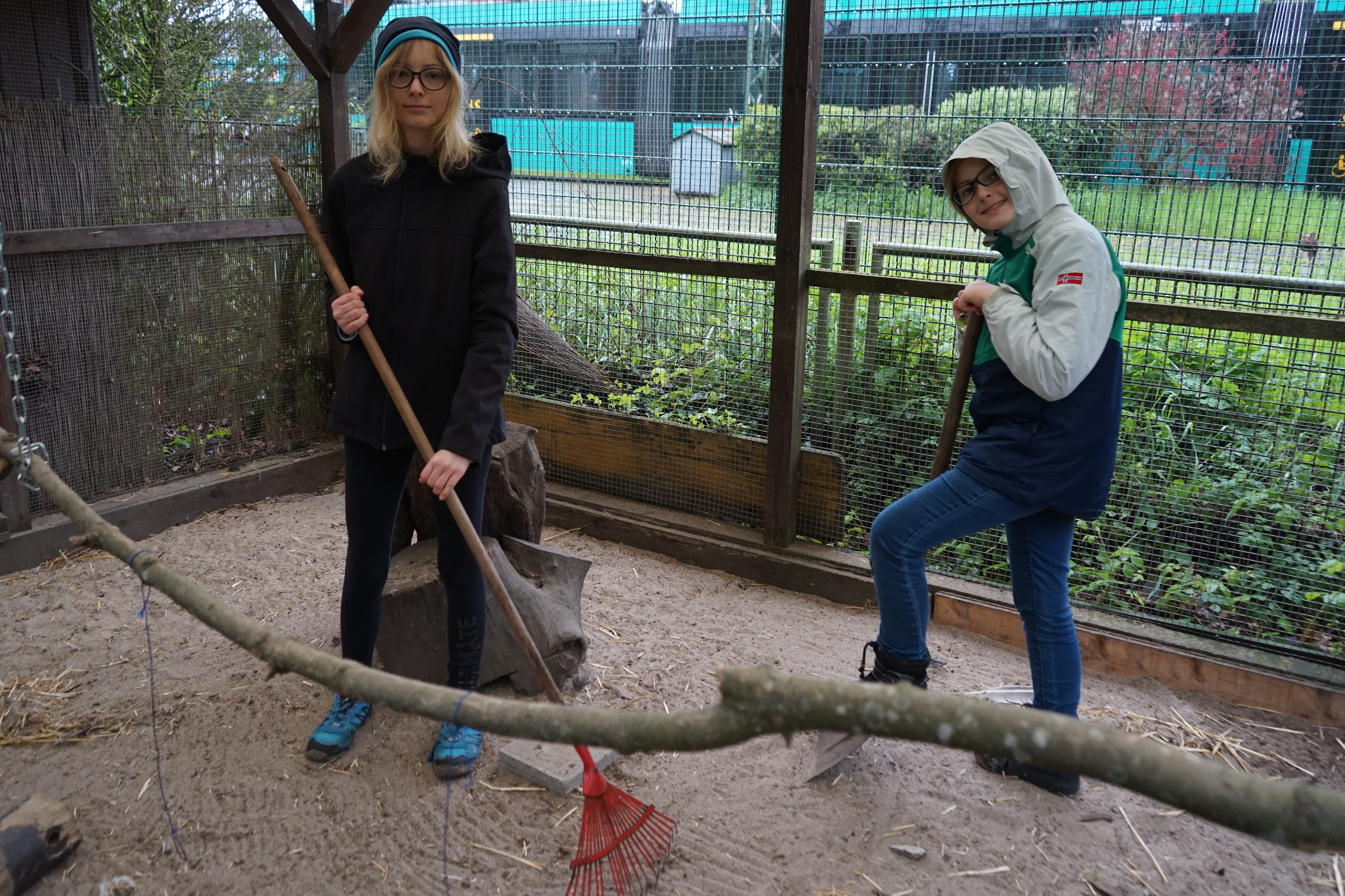 Im Kobelt Zoo in Schwanheim profitieren Kinder nur in zweiter Linie vom 72-Stunden-Einsatz des Pfadfinderstammes Charles de Foucauld aus Niederrad; vor allem freuen sich die Tiere über die Aktion. Die Betreuer Sarah Braun und Johnny Santana sind mit 25 Kindern, Jugendlichen und jungen Erwachsenen auf dem Gelände unterwegs, füttern Tiere, misten Ställe aus und reparieren Zäune. „Der Zoo eröffnet am 1. Mai und wir helfen, ihn frühlingsfein zu machen“, erklärt Sarah Braun. 300 Tiere auf 17.000 Quadratmetern gibt es hier, da ist viel zu tun. „Für uns ist es der perfekte Einsatzort, weil der Zoo alle Altersstufen aus unseren Gruppen anspricht, deshalb sind wir auch schon zum dritten Mal hier im Rahmen der 72-Stunden-Aktion“, so die Leiterin. Die Geschwister Maja (14) und Noah (12) sind mit dabei und helfen, den Truthahnkäfig auszumisten. Zoo-Mitarbeiter Sascha Vogt zeigt ihnen, wie sie die Tiere mit Futterpellets füttern können, dazu gibt es frischen Salat. „Wir haben zwar auch Haustiere zuhause, aber Truthähne haben wir noch nie so aus der Nähe gesehen“, erzählen die Zwei. Dass es so stark regnet und sie mindestens so durchnässt sind wie das triefend nasse Pony im Nachbargehege, sehen sie gelassen: „Es ist halt noch nicht Sommer.“ Und immerhin geht’s zum Übernachten wieder nach Hause.
