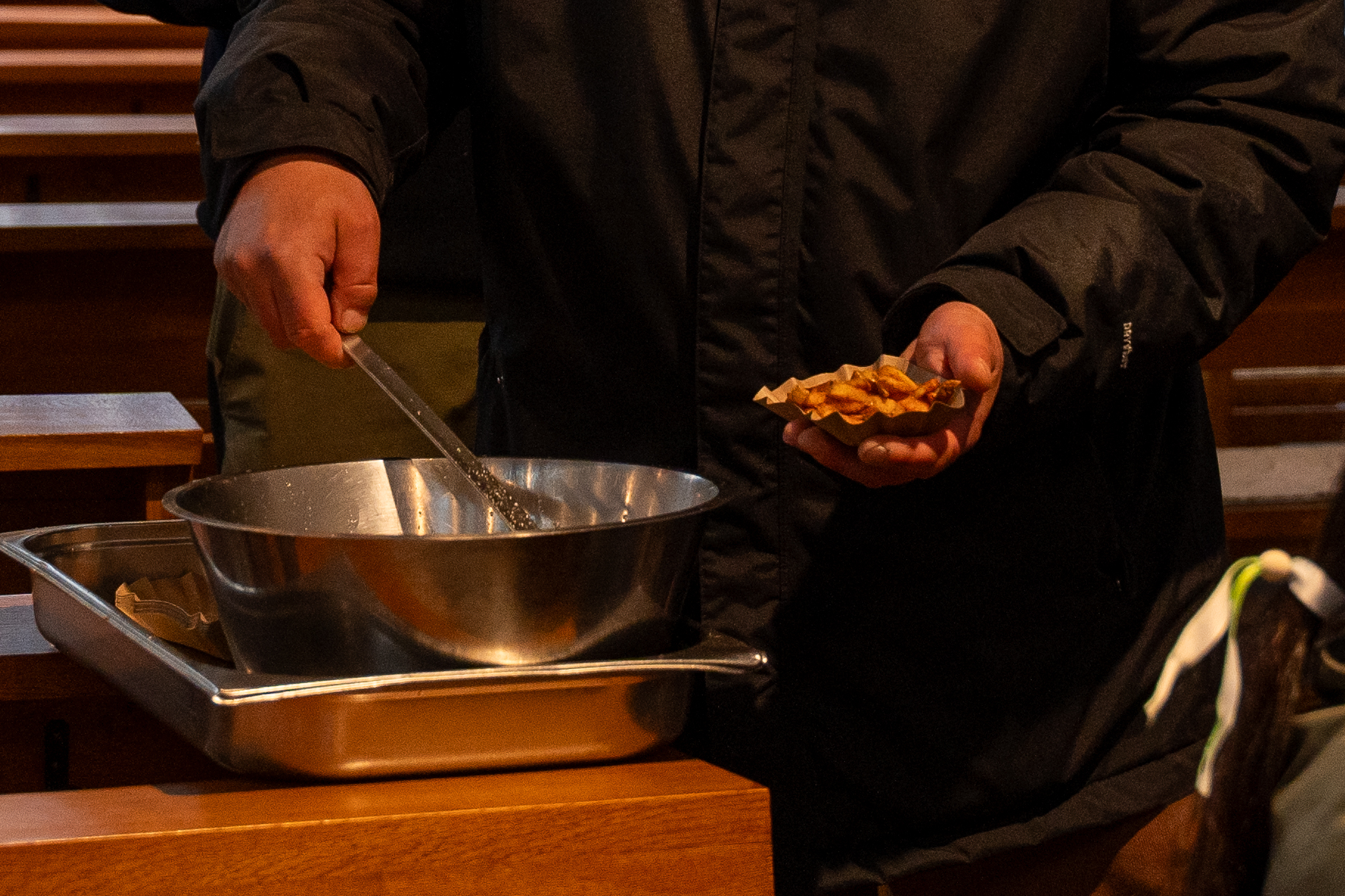 Vom Regen wenig beeinträchtigt sind die 15 Kinder und Jugendlichen zwischen sieben und 18 Jahren, die derzeit in St. Wendel in Sachsenhausen Holzmöbel abschleifen und neu lasieren, eine Bank und eine Gartenhütte bauen und alles Mögliche reparieren. Der Pfadfinderstamm Marcel Callo, eigentlich beheimatet in Nieder-Erlenbach, campiert im Gemeindehaus – und konnte viele der Arbeiten kurzerhand nach Drinnen verlegen. Lara (16) ist im Schleifraum beschäftigt, aus dem lautes Surren und Quietschen durch die geschlossenen Türen in den großen Saal dringt. Hier schleift sie mit einer Maschine eine Holzbank ab. Besser wärs natürlich draußen, aber so trägt sie gegen den Staub eben eine Maske. „Ich finde die Aktion hier richtig cool“, meint sie. Zwar sei sie ziemlich aufgeregt gewesen, zu erfahren, welches Projekt ihre Gruppe bekommen würde – immerhin haben sich die Marcel Callos ihre Aufgabe nicht selbst ausgesucht, sondern sich überraschen lassen. „Aber ich hab mich sehr gefreut, es macht viel Spaß.“ Peter Grünzner, Simon Klinger, Tobias Klüsener und David Gettke sind gemeinsam mit vier weiteren Personen für die Leitung der großen Gruppe zuständig. „Das Wetter ist halt blöd“, räumt Tobias Klüsener ein. „Aber als Pfadfinder ist man an Regen gewöhnt.“ Klar gebe es immer Teilnehmende, die motiviert seien als andere. Aber auch für die, die weniger Lust hätten, fände ich immer eine kleine Aufgabe. Dass am Sonntag in St. Wendel Erstkommunion gefeiert wird, ist ein Anreiz, alle Aufgaben von der Liste so gut und schnell abzuarbeiten wie möglich: „Wir denken schon, dass die Leute sich freuen werden“, sind die Pfadfinder:innen überzeugt.