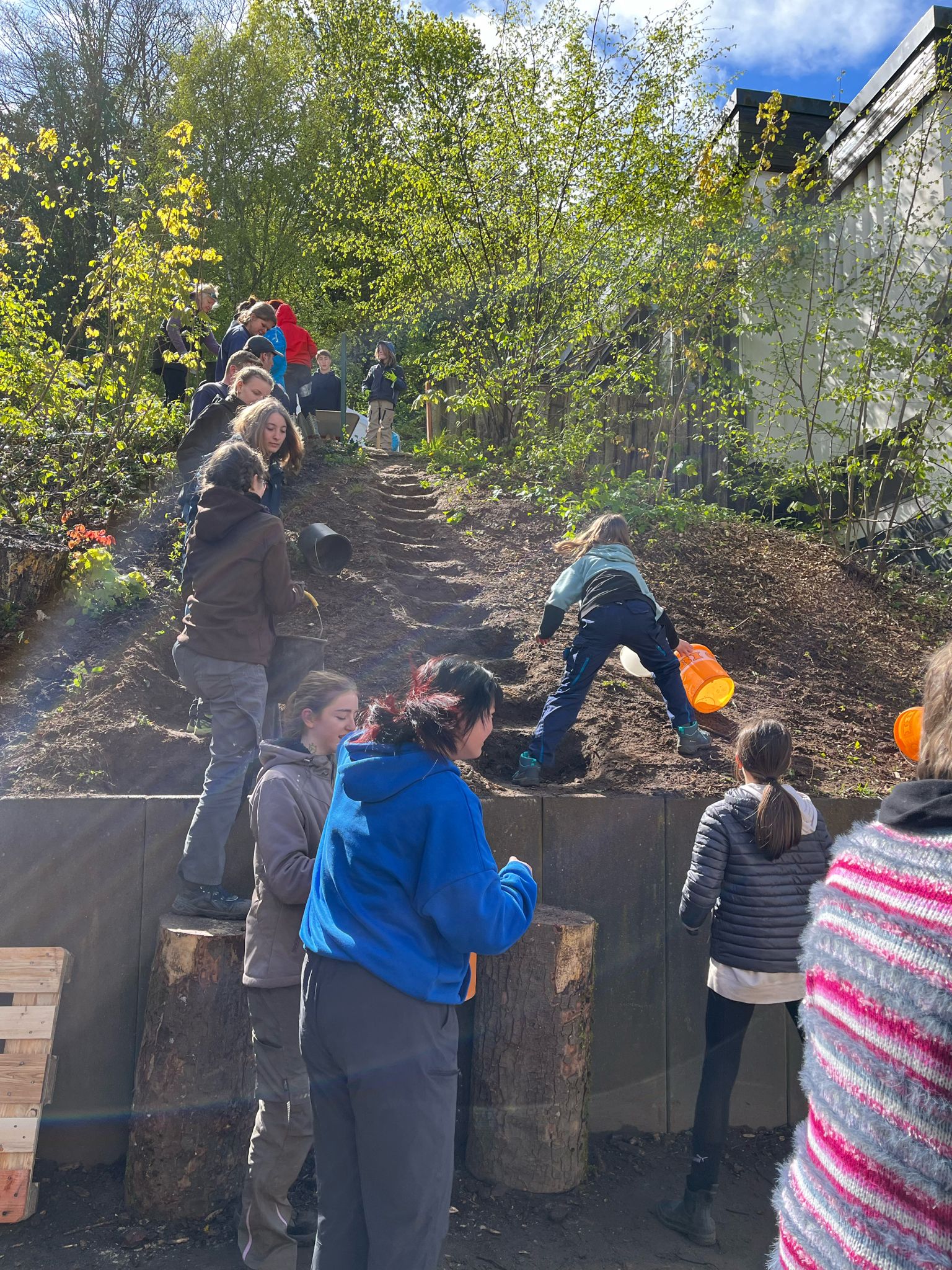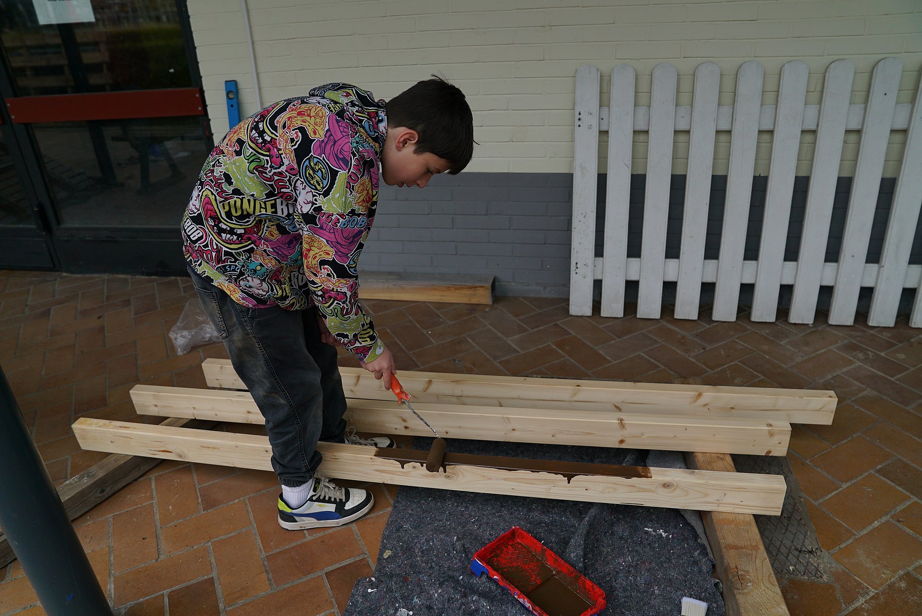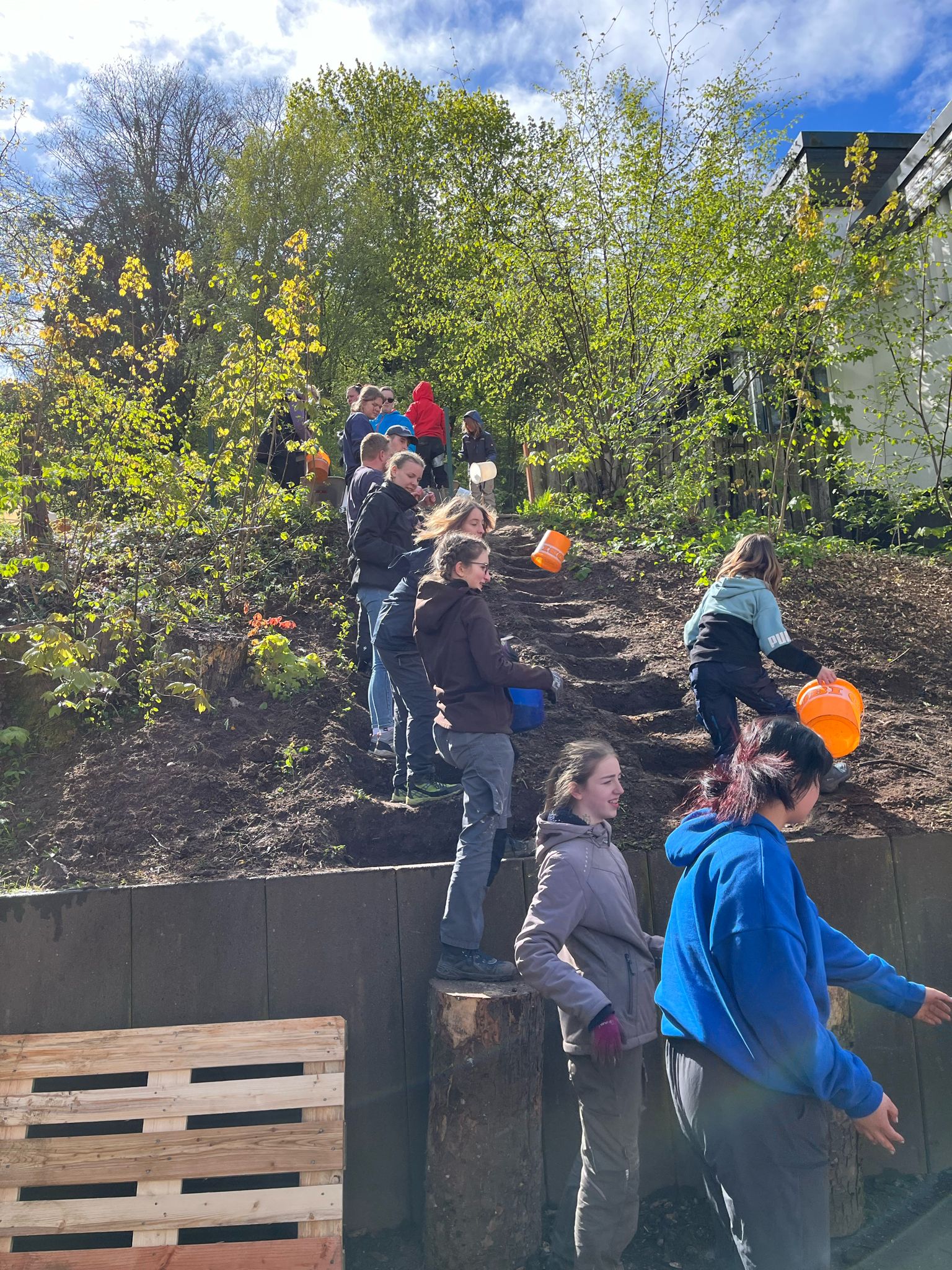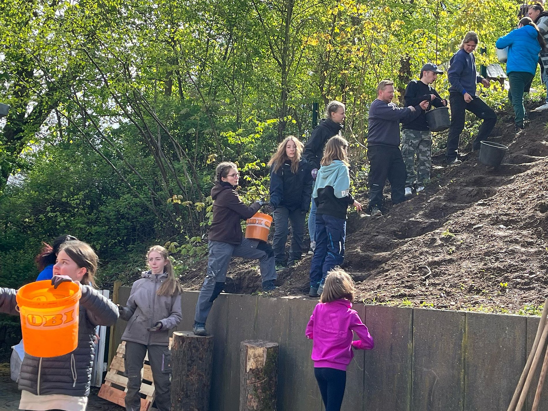 Im Naturkindergarten am Kirschenwäldchen, Lärchenweg, in Wetzlar werden kleine Bauprojekte umgesetzt: von neuen Garderoben, zum Beispiel für die Gummistiefel, und Kleiderboxen für Wechselkleidung über das Reparieren des Zauns bis hin zu einem Barfußpfad im Wald. Hier ist die Aktionsgruppe „ULF & MaJu“ im Einsatz, bestehend aus der Pfarrjugend und der Malteserjugend.