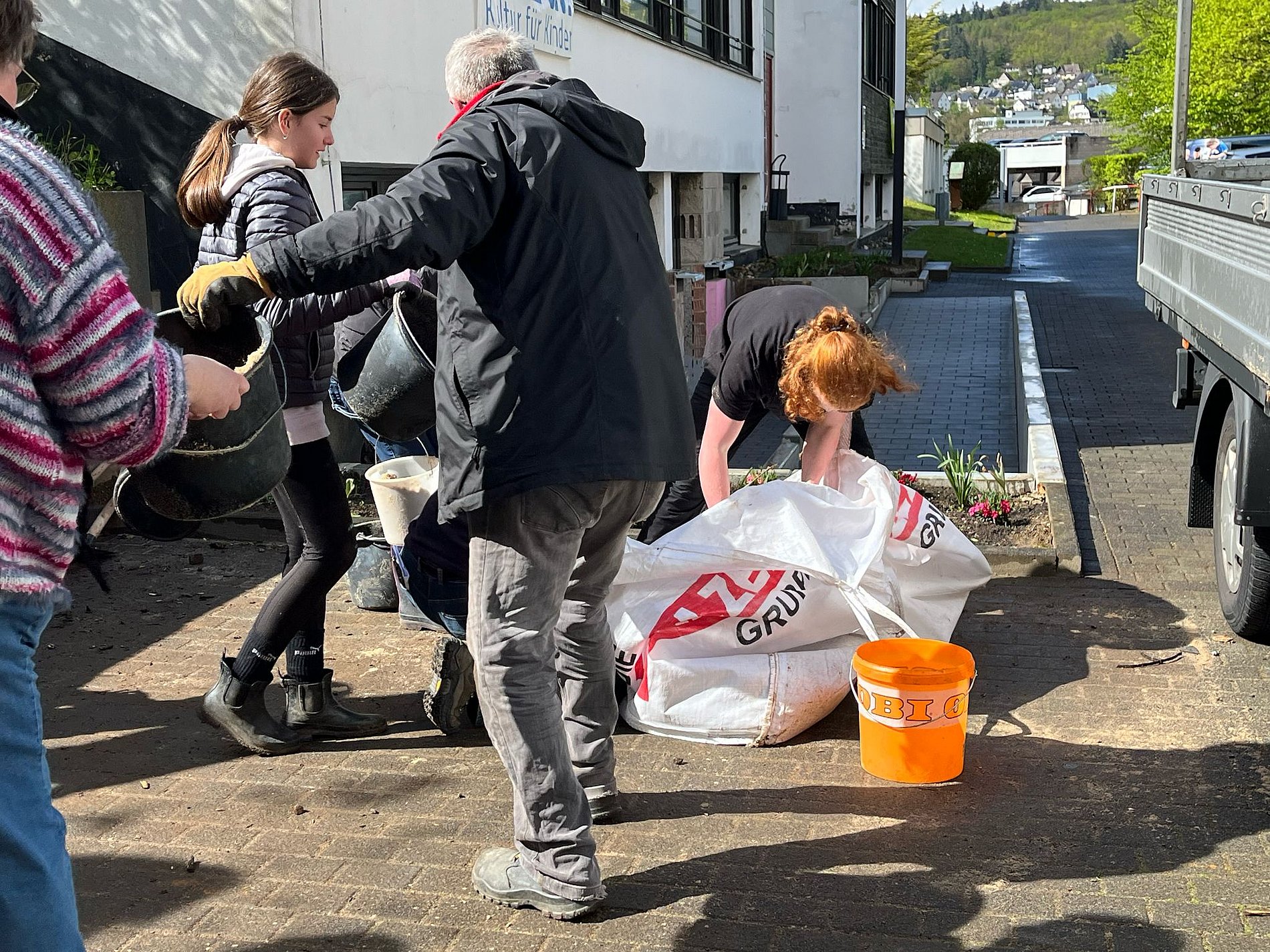 Der Kids Club Waldsolms baut einen Jugendclub-Container und legt Blumenbeete an.